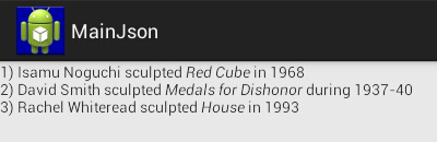 packagecom.mdoery.tut.json;importjava.io.IOException;importjava.io.InputStream;importorg.json.JSONArray;importorg.json.JSONException;importorg.json.JSONObject;importorg.json.JSONTokener;importandroid.os.Bundle;importandroid.app.Activity;importandroid.content.Context;importandroid.text.Html;importandroid.text.Spanned;importandroid.widget.TextView;publicclassMainActivityextendsActivity{privatestaticStringsep=System.getProperty("line.separator");privatestaticStringbr="<br>";@OverrideprotectedvoidonCreate(BundlesavedInstanceState){super.onCreate(savedInstanceState);setContentView(R.layout.activity_main);TextViewtv=(TextView)this.findViewById(R.id.textView1);try{// Read contents of file sculptors.json Stringjson=getText("json/sculptors.json",getApplicationContext())+sep;// Display it in TextViewdisplaySculptorNames(tv,json);}catch(Exceptione){// If there is an exception, show it in the TextViewtv.setText("Exception: "+sep+e+sep);}}privateStringgetText(Stringfilename,Contextctx)throwsIOException{InputStreamis=ctx.getAssets().open(filename);// We guarantee that the available method returns // the total size of the asset not more than 2G.intsize=is.available();// Read the entire asset into a local byte buffer.byte[]buffer=newbyte[size];is.read(buffer);is.close();Stringtext=newString(buffer);returntext;}/** * Extracts information from JSON text, and displays it in TextView * @param tv TextView * @param json String of json from file sculptors.json * @throws JSONException */privatevoiddisplaySculptorNames(TextViewtv,Stringjson)throwsJSONException{Stringtext="";JSONTokenertokener=newJSONTokener(json);JSONObjectobject=(JSONObject)tokener.nextValue();JSONArraysculptors=object.getJSONArray("sculptors");for(intii=0;ii<sculptors.length();ii++){text+=(ii+1)+") ";JSONObjectobj=sculptors.getJSONObject(ii);JSONObjectsculptor=obj.getJSONObject("sculptor");Stringfirstname=sculptor.getString("firstname");Stringlastname=sculptor.getString("lastname");JSONObjectsculpture=sculptor.getJSONArray("sculptures").getJSONObject(0).getJSONObject("sculpture");Stringname="<i>"+sculpture.get("name")+"</i>";text+=firstname+" "+lastname+" sculpted "+name;Stringdate=sculpture.getString("date");try{Integer.parseInt(date);text+=" in "+date;}catch(NumberFormatExceptione){// catch date rangetext+=" during "+date;}text+=br;}Spannedspan=Html.fromHtml(text);tv.setText(span);}}